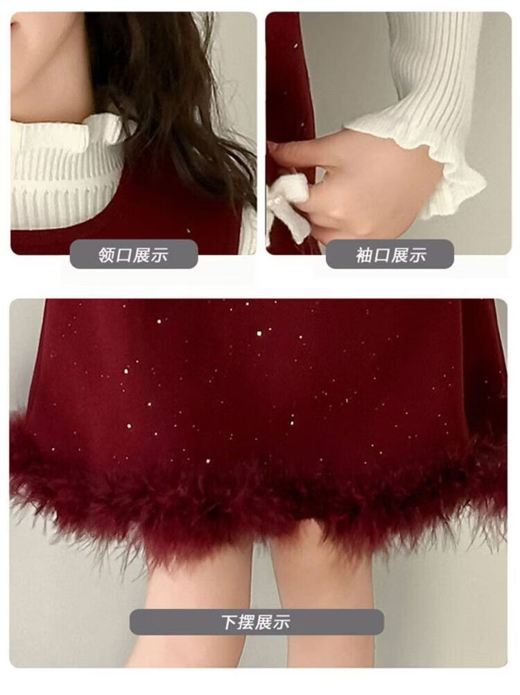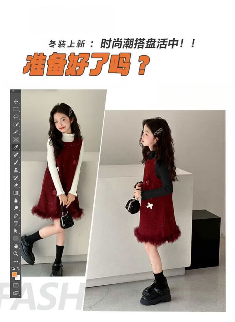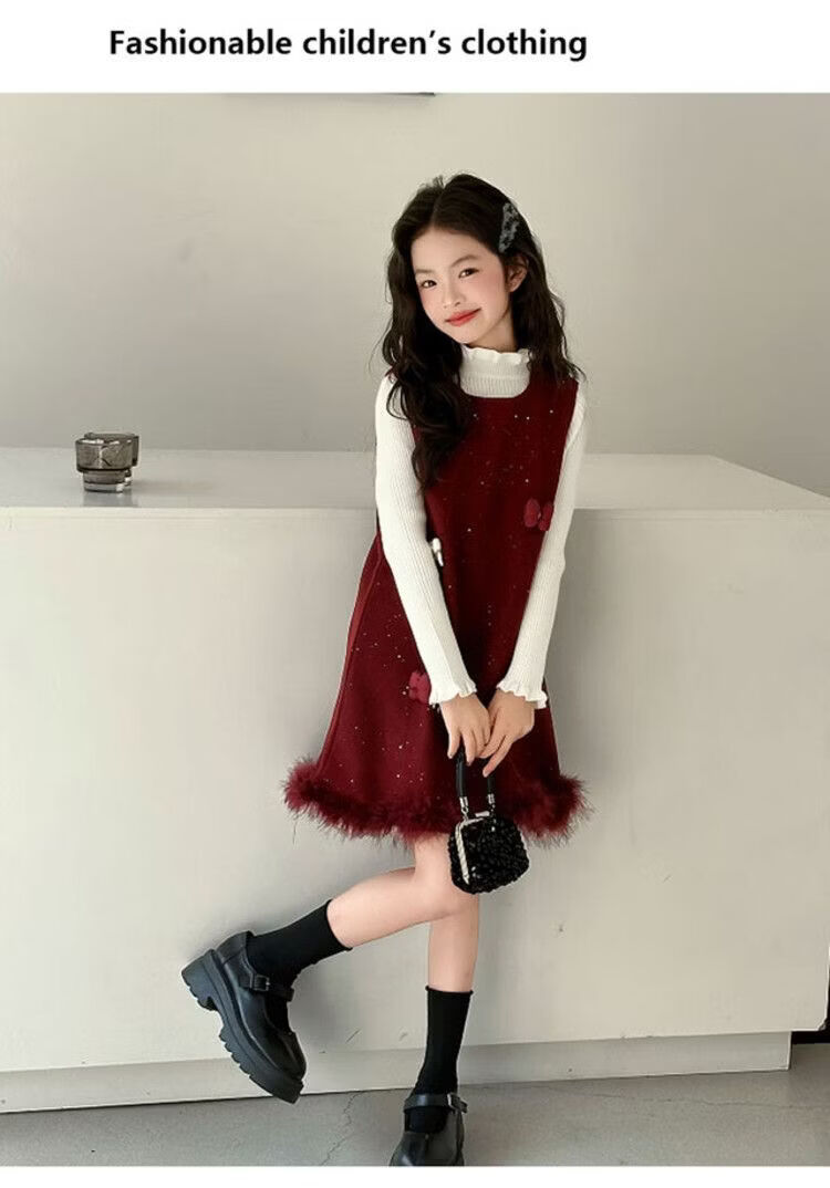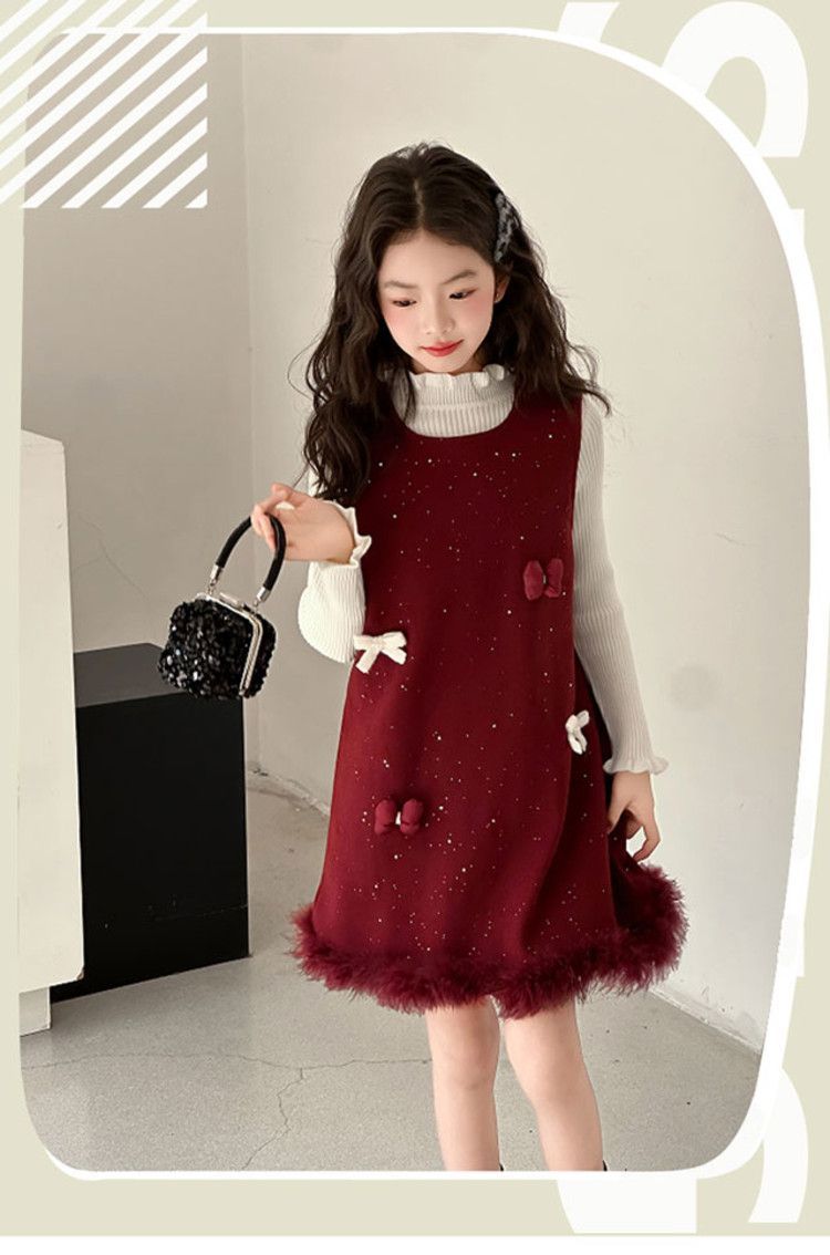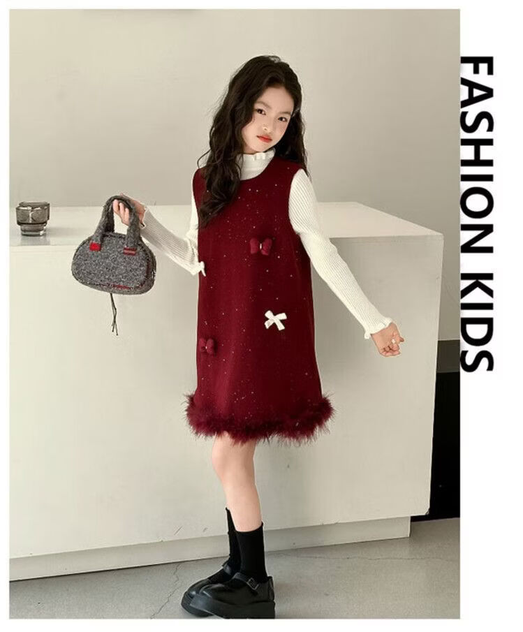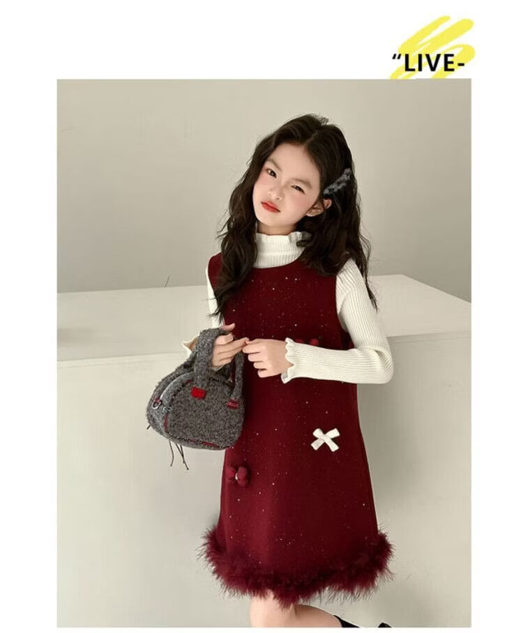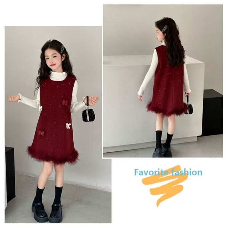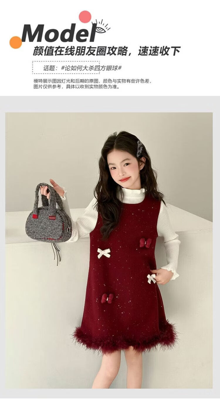 甜贝星女童红色连衣裙秋冬季2025新款女孩拜年服儿童超好看加绒裙子套装 黑色套装 170