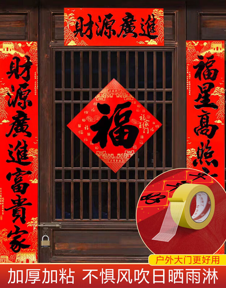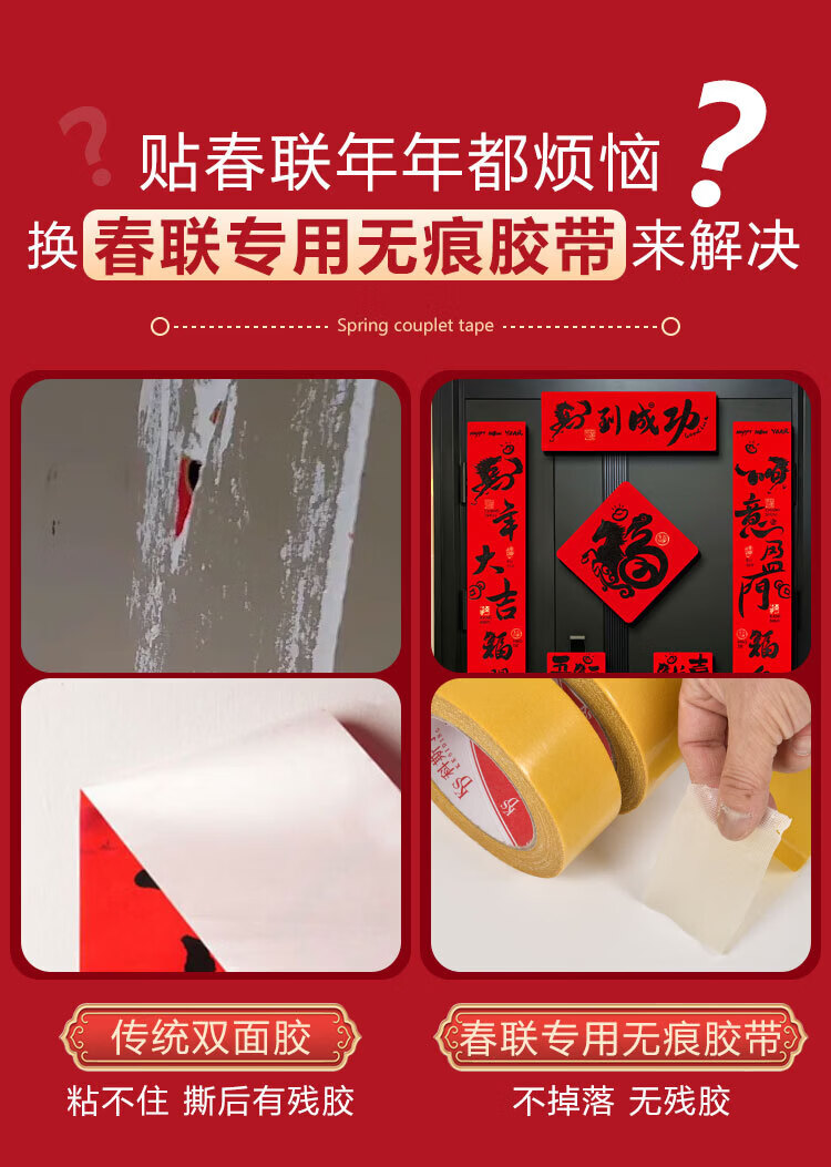 MEEIAOREY春联专用双面胶福字红色胶带春联双面胶高粘度对联无痕胶结婚婚房婚车年画专用强粘无痕双面胶胶逞 春联福字双面胶【1.5厘米宽8米长】足米/不虚标 2卷