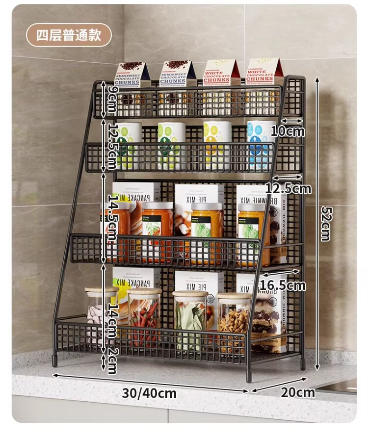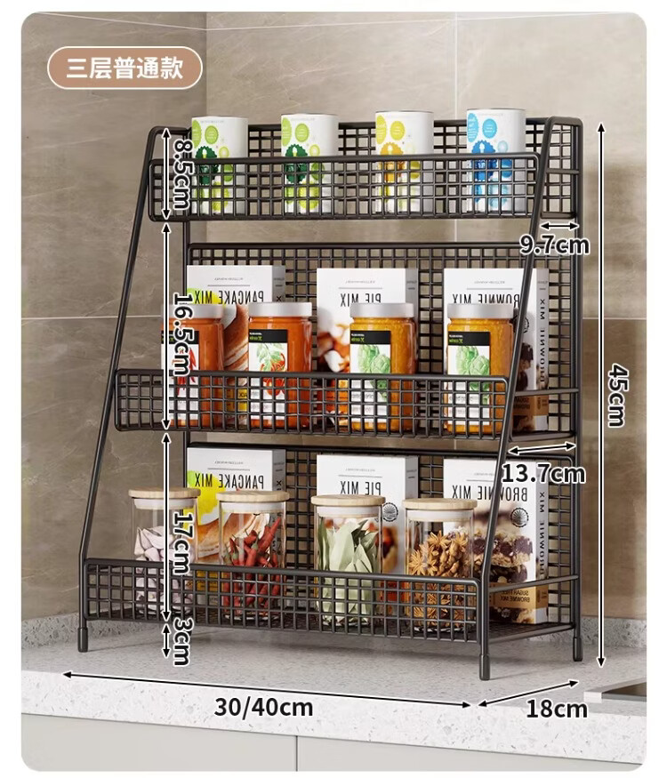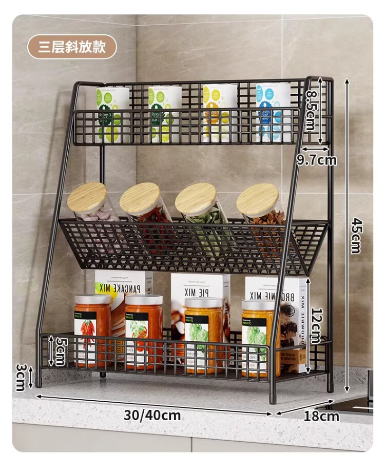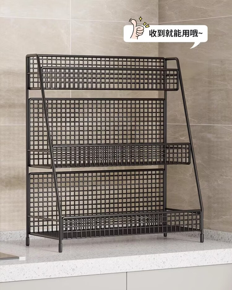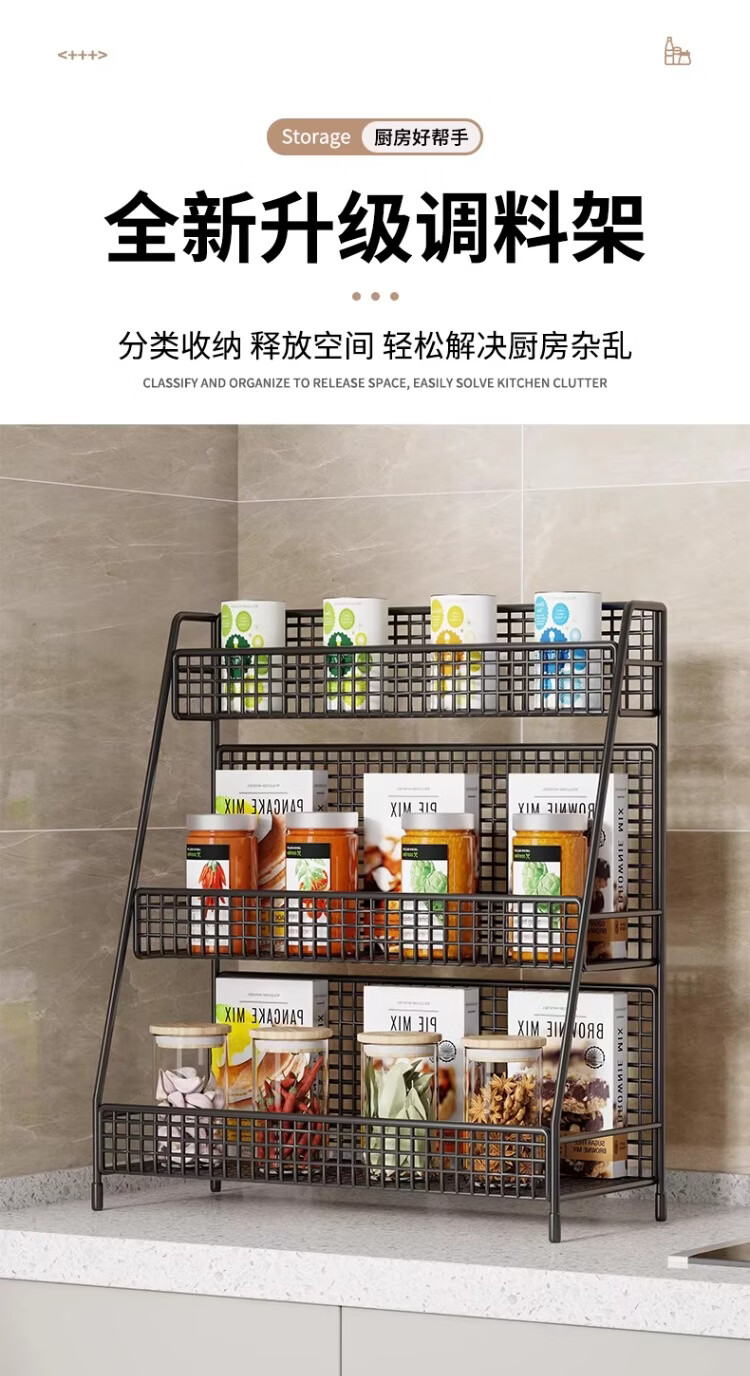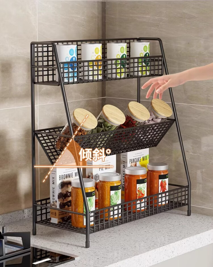 尔思家厨房置物架可伸缩多功能调料架台面多层收纳架台面葱姜蒜储物架 黑色中号(三层)-斜放款