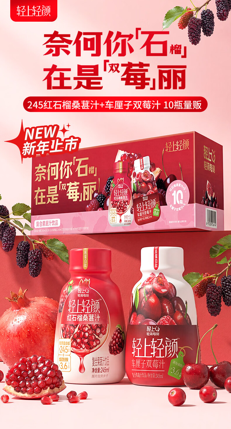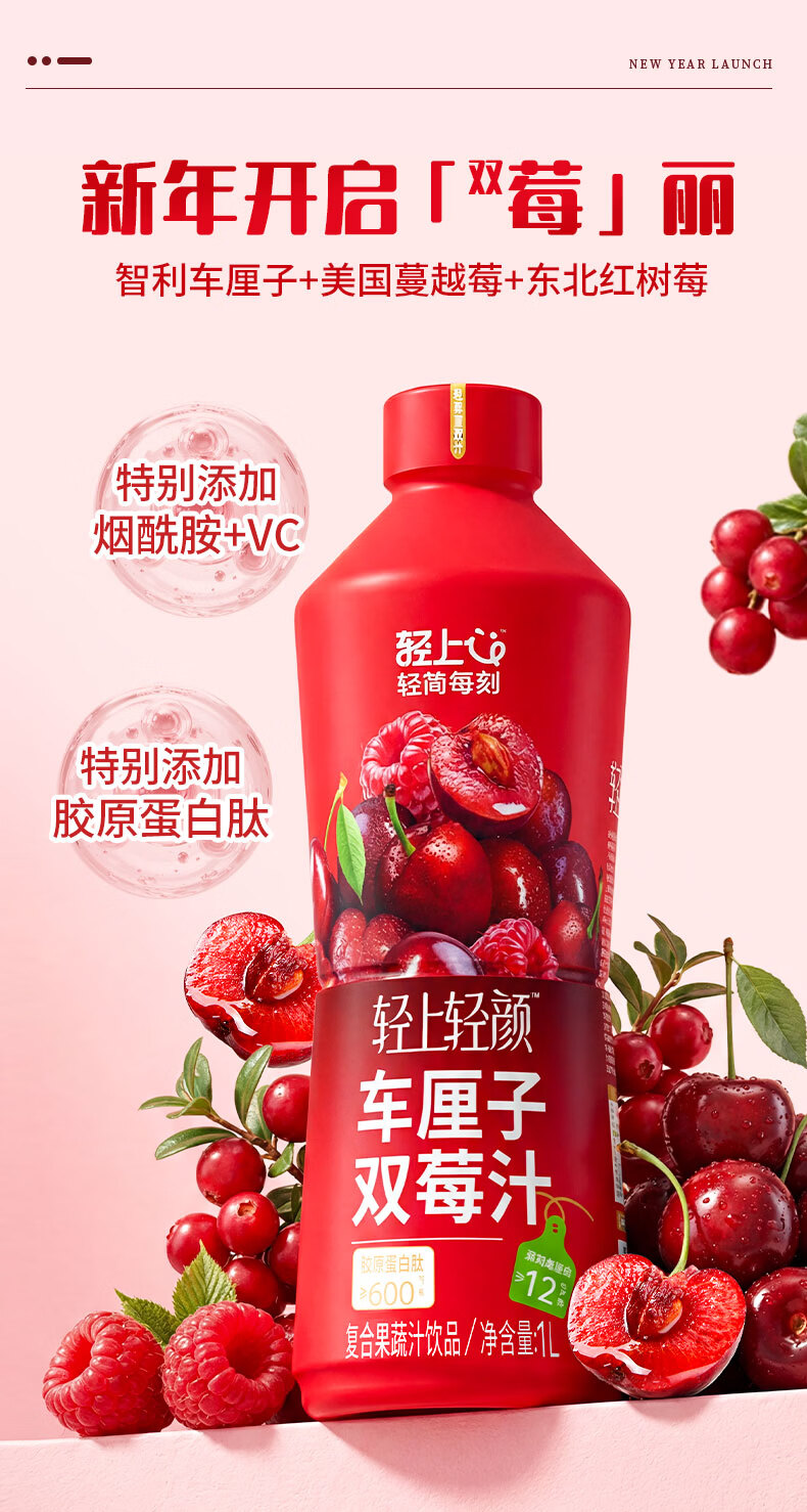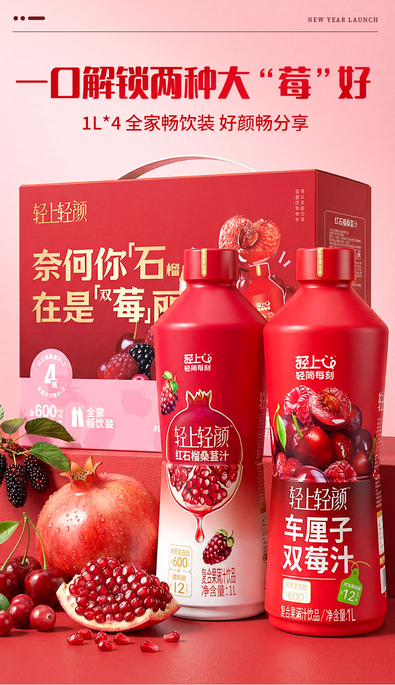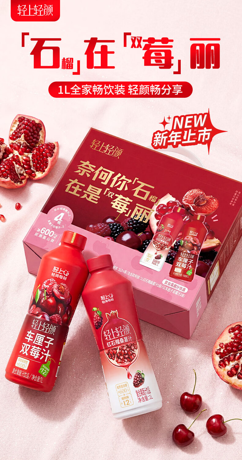 轻上【年货送礼】轻颜红石榴桑葚汁车厘子双莓汁富含维C酸甜可口整箱 红石榴桑椹汁1L*2瓶+车厘子双莓汁1L*2