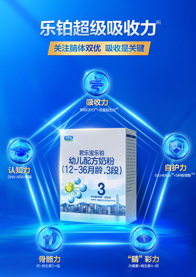 君乐宝(JUNLEBAO)奶粉乐铂幼儿配方奶粉(12-36个月龄,3段)400克*12盒 含OPO结构脂