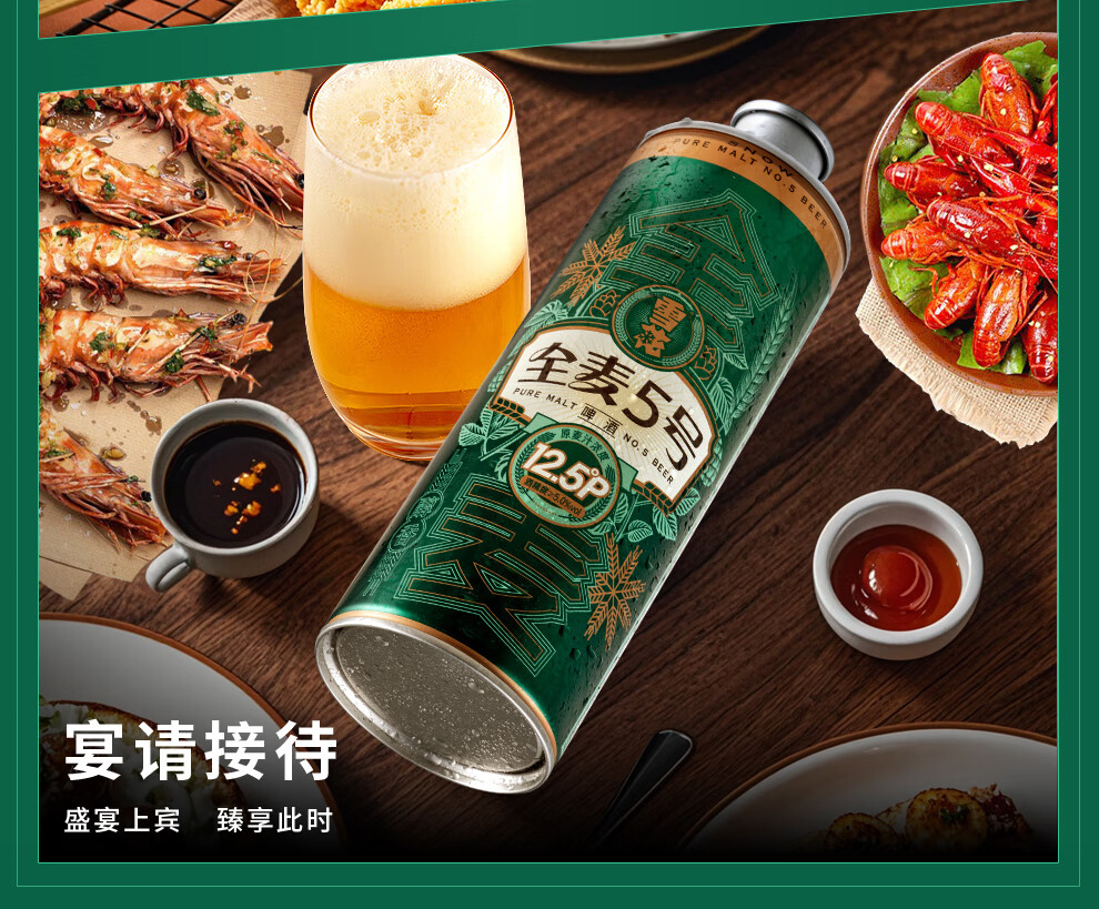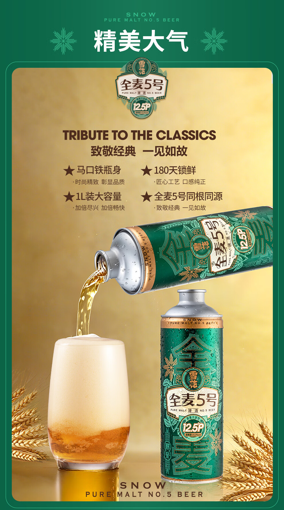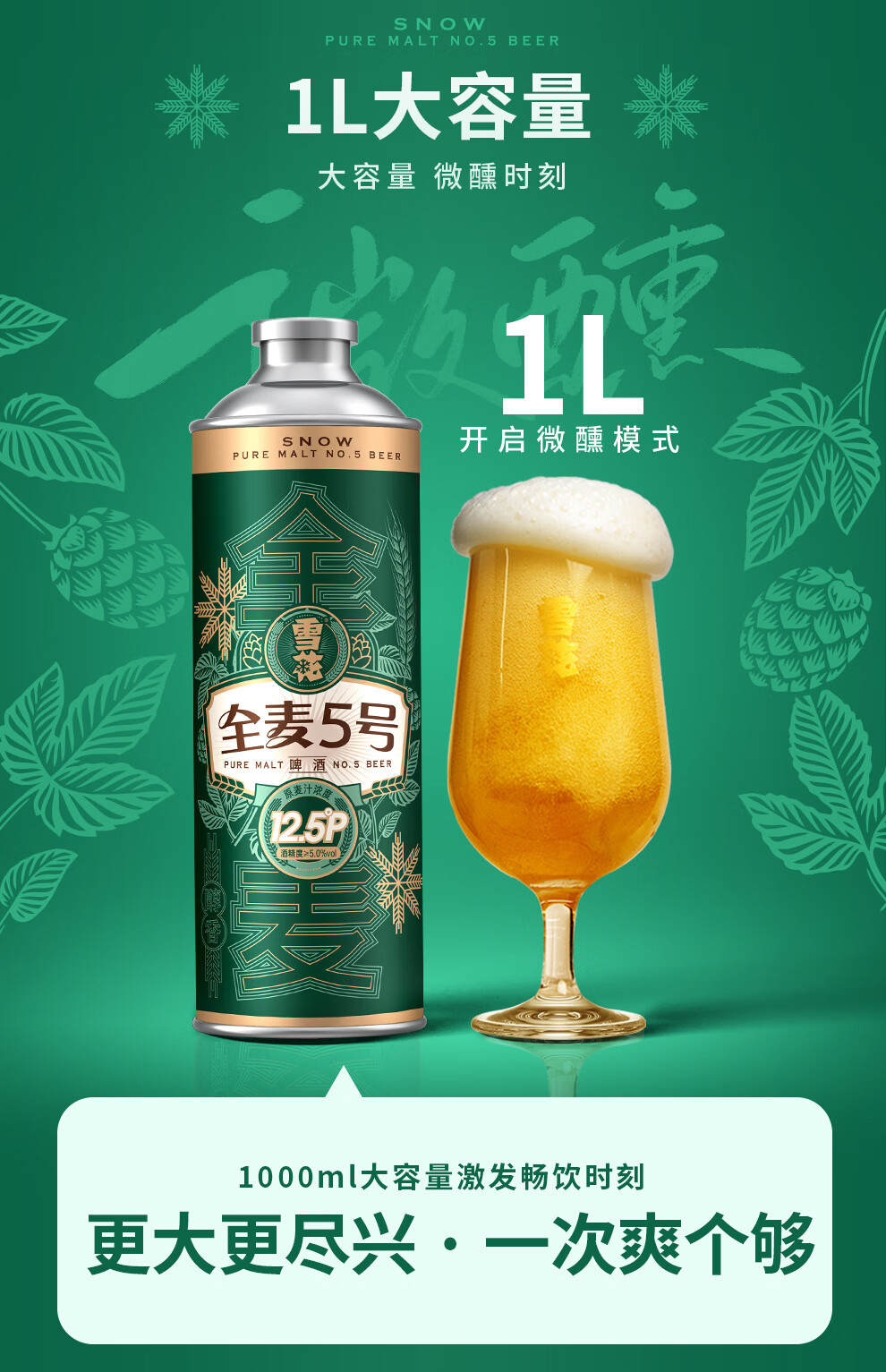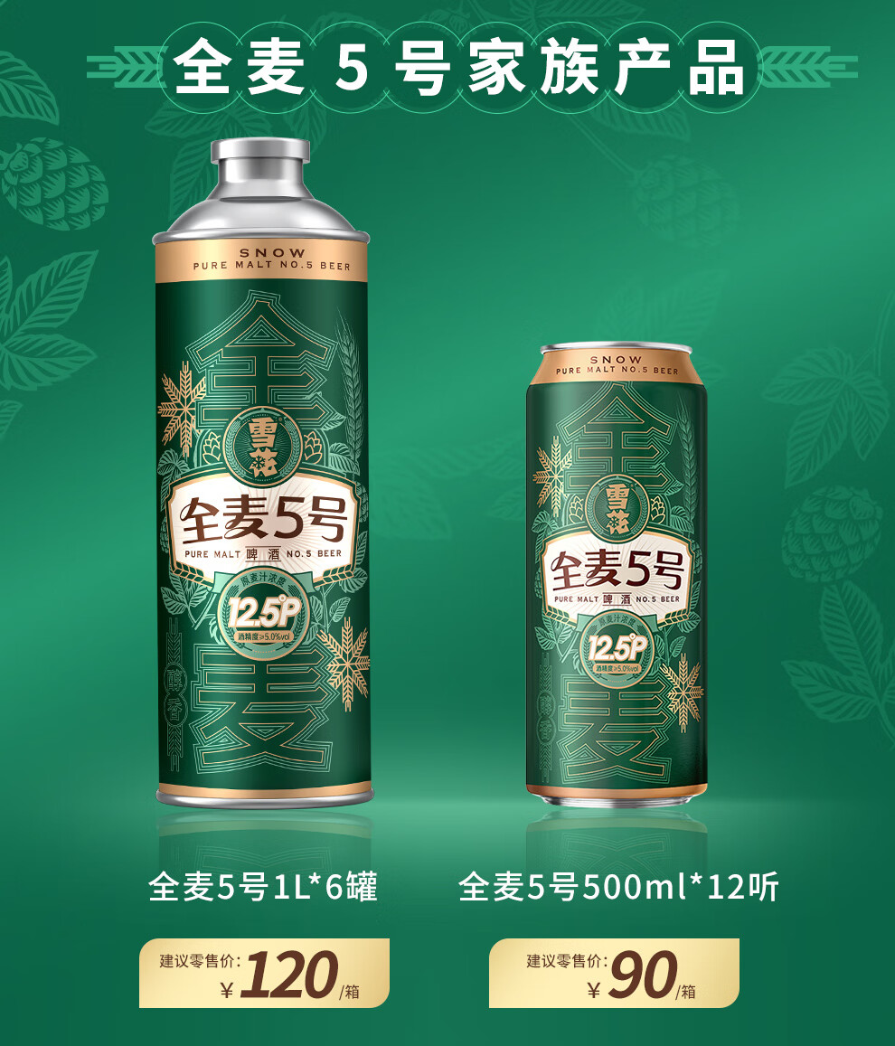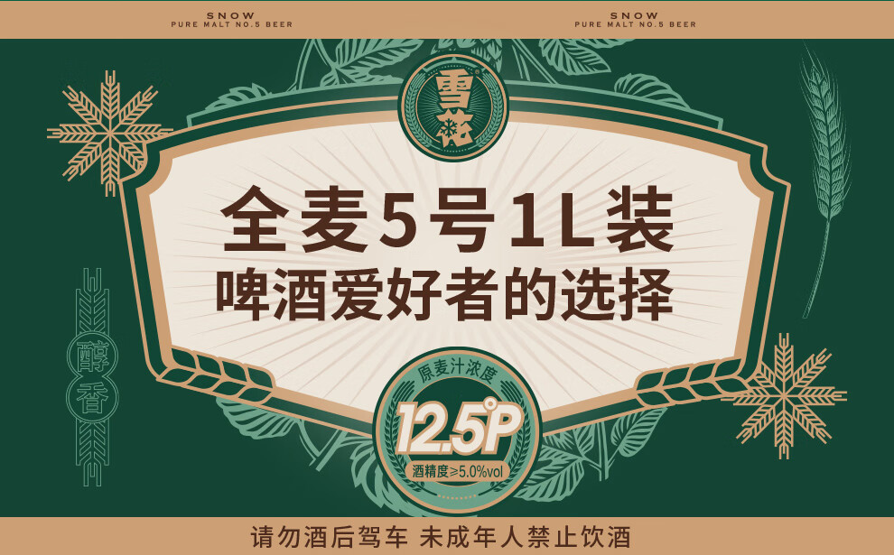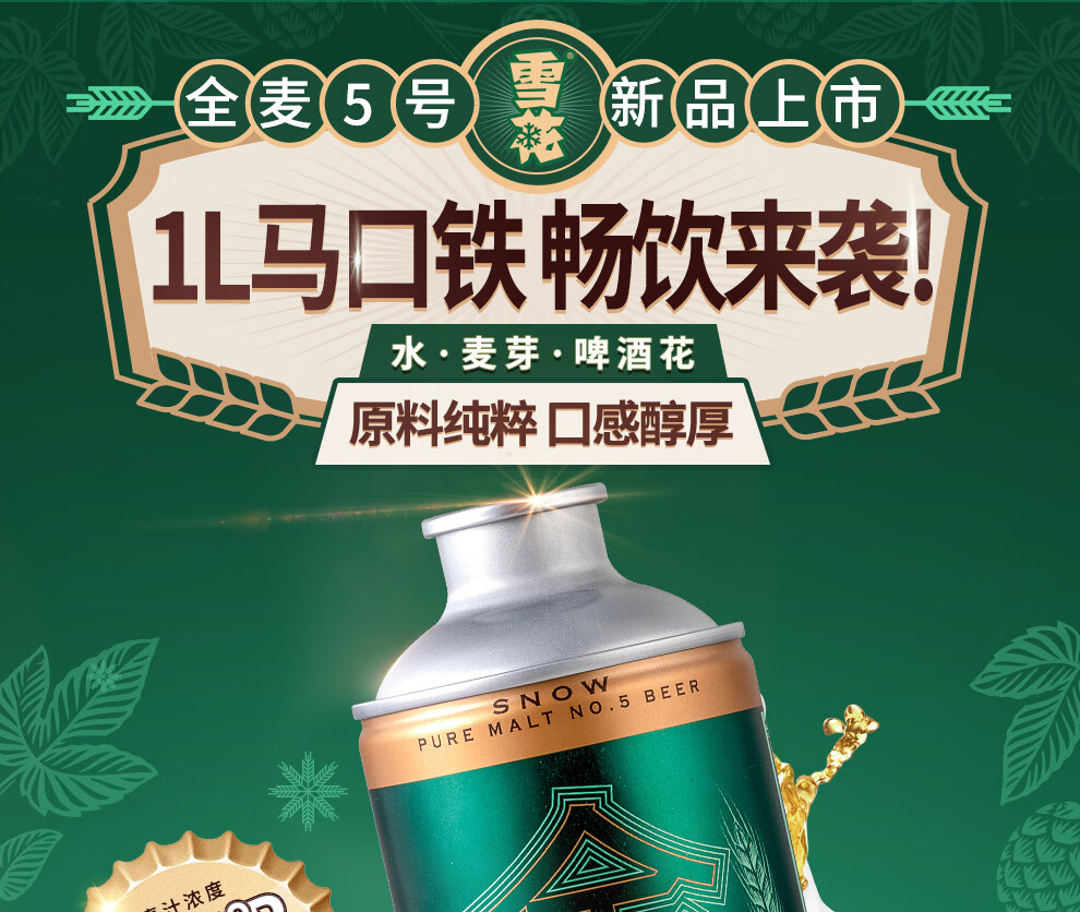 雪花啤酒【1L微醺款】全麦5号1L*6罐高端马口铁12.5度 新年送礼