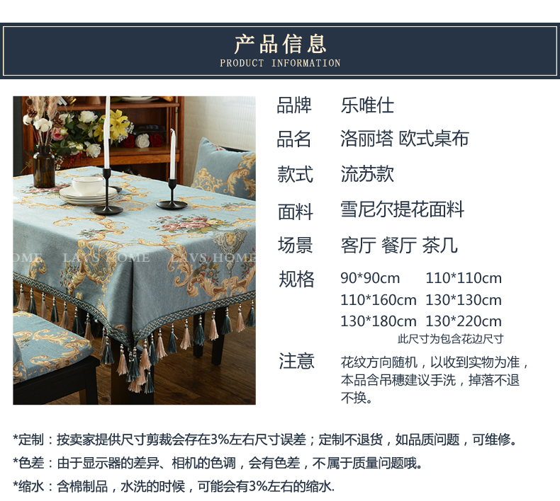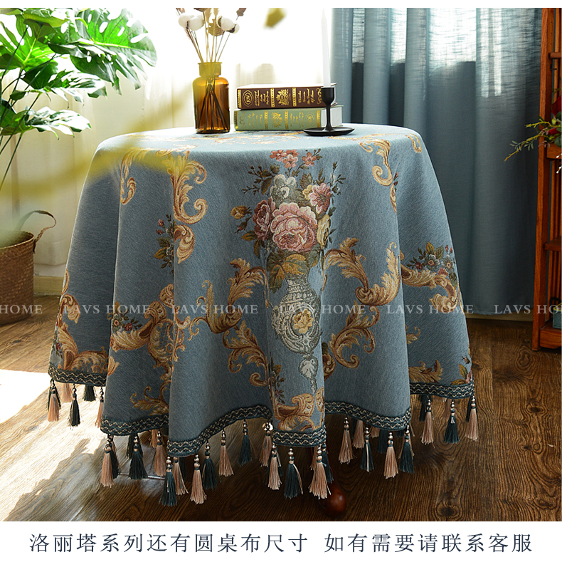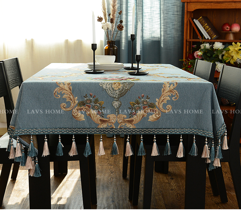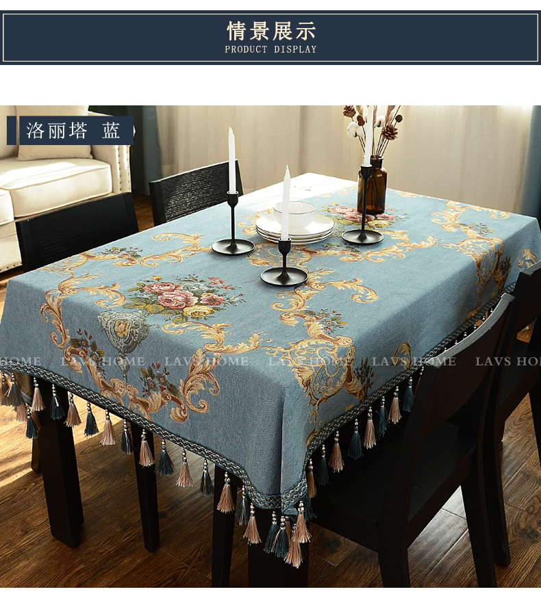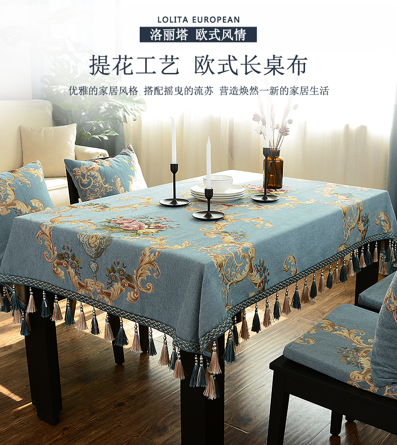 乐唯仕 高端欧式餐桌桌布高档台布奢华长方形茶几桌布布艺轻奢高级感正方形餐桌垫客厅家用西餐桌子垫子定制 洛丽塔-蓝 130*180cm(常用餐桌布)