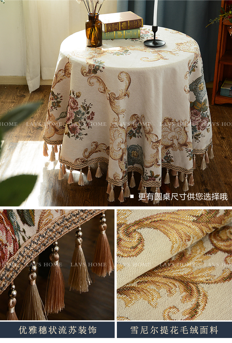 乐唯仕欧式大圆桌桌布2025新款轻奢高级感小圆形茶几台布客厅家用餐桌布 莫利斯花园-米(吊穗款) 220cm直径适合直径160-180cm圆桌