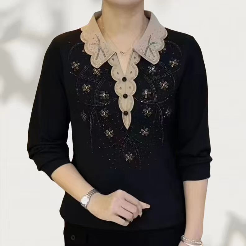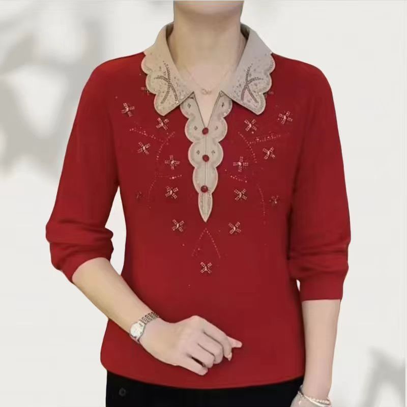 春秋新款时尚妈妈装洋气烫钻翻领小衫气质显瘦百搭长袖减龄上衣女