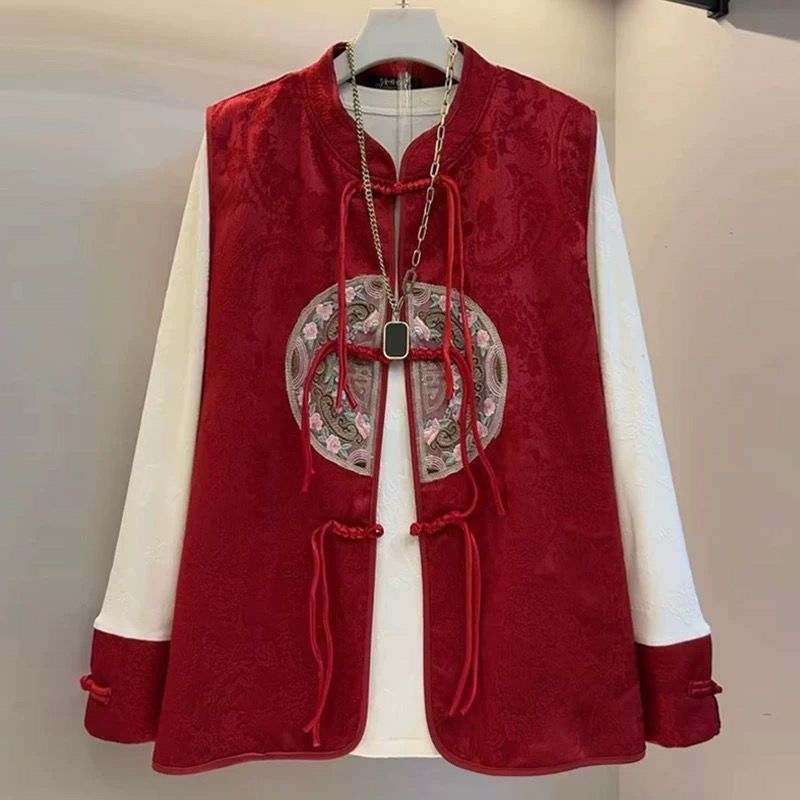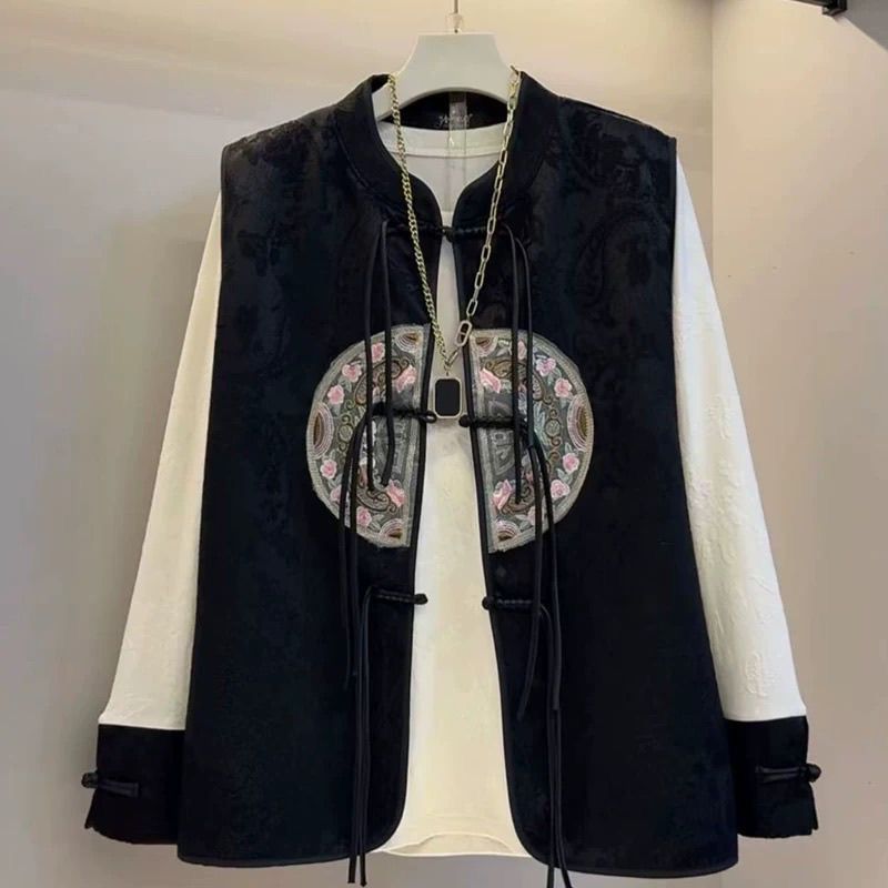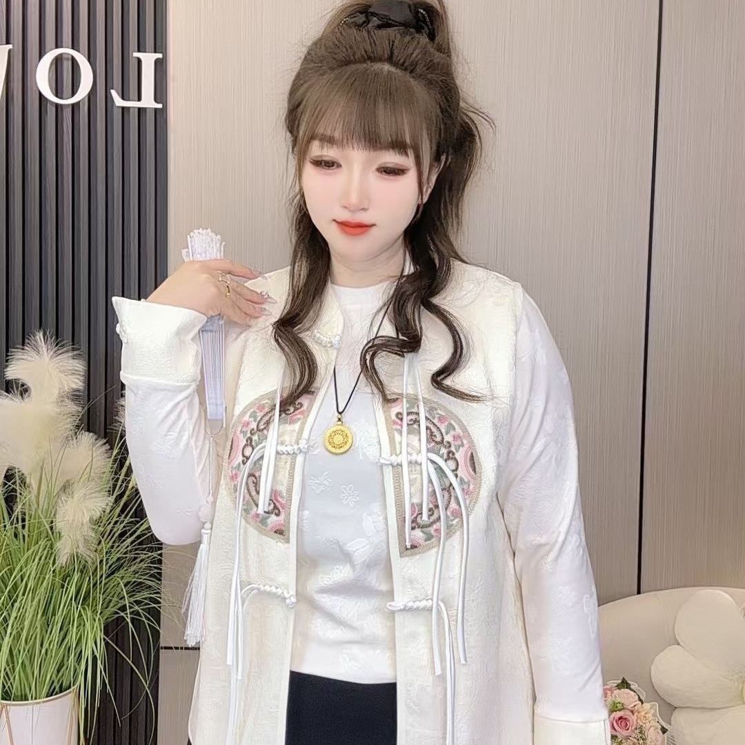 新中式中国风绣花马甲+t恤两件套民族风流苏盘扣洋气上衣打底衫潮