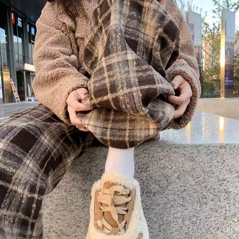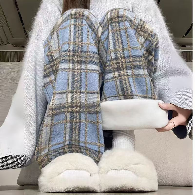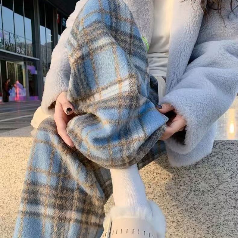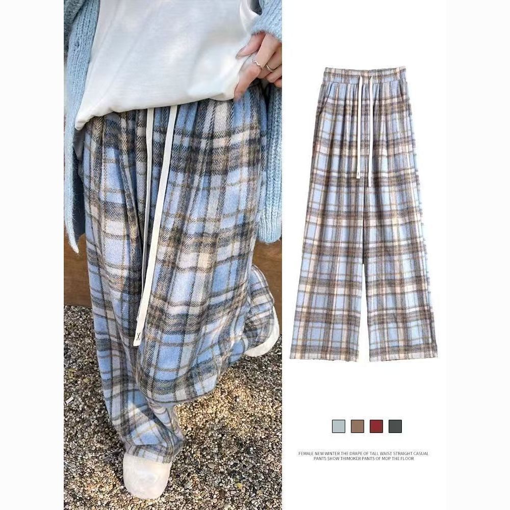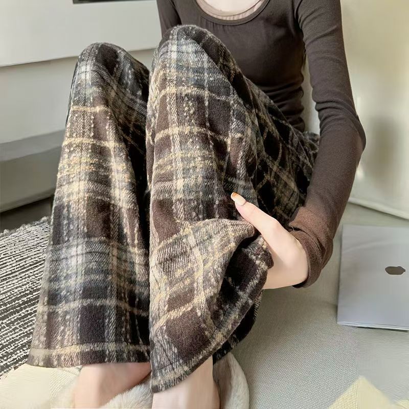 直筒高腰复古毛呢格子阔腿裤2025冬季新款加长休闲阔腿裤加绒保暖