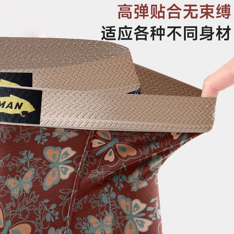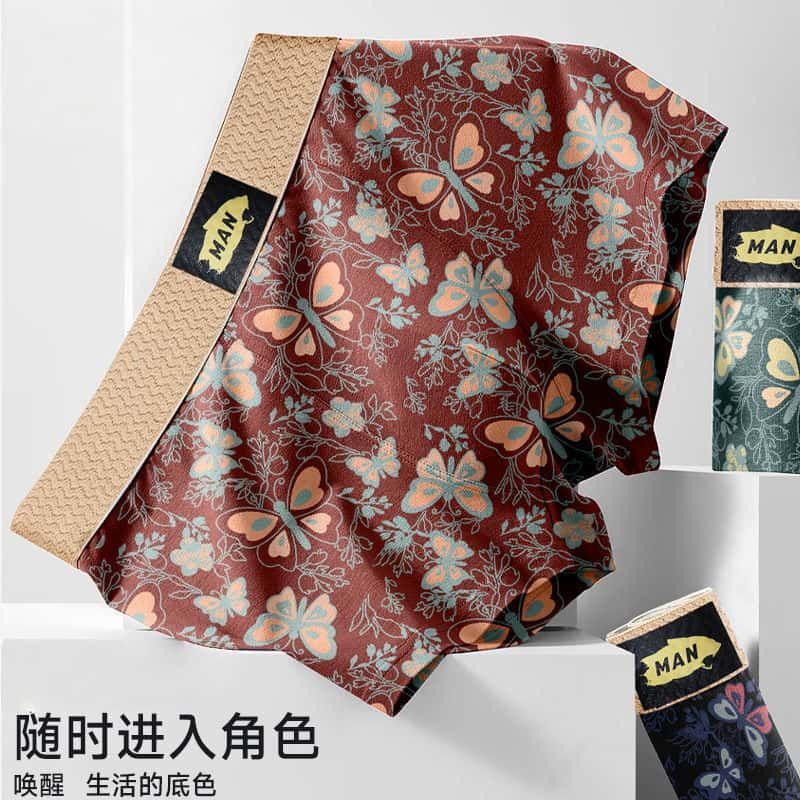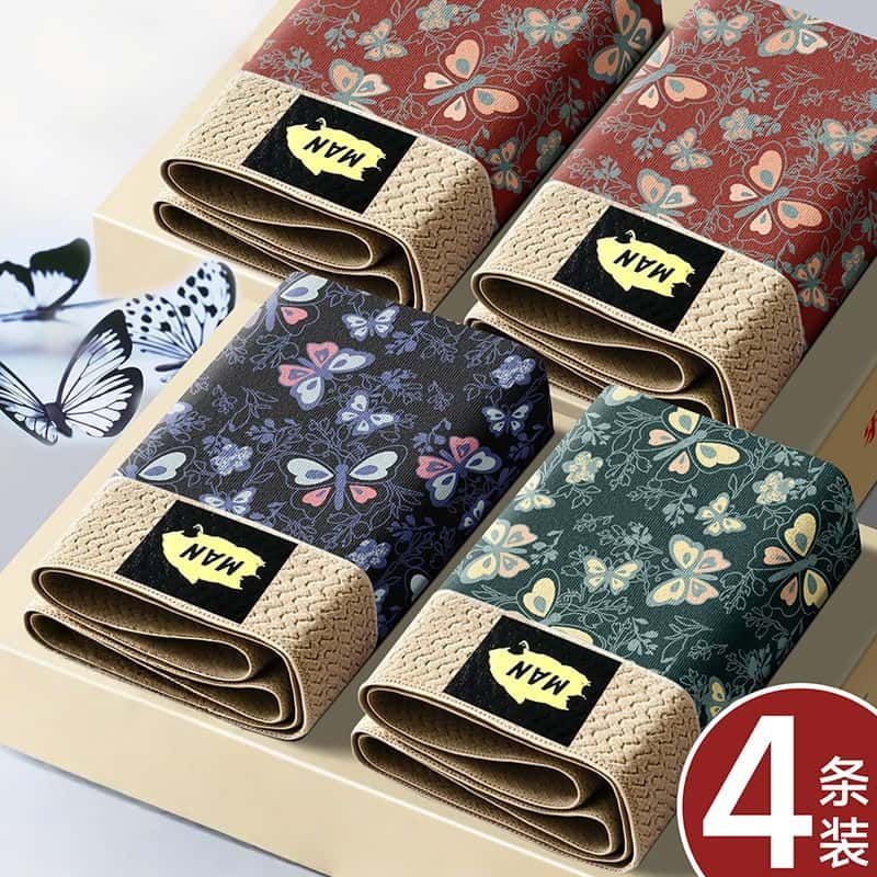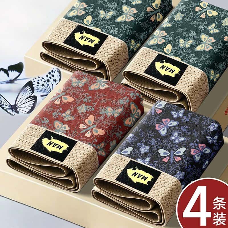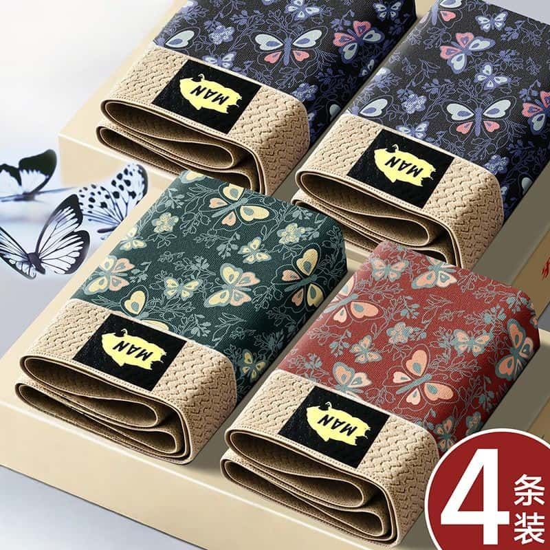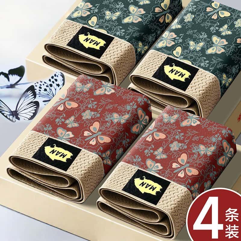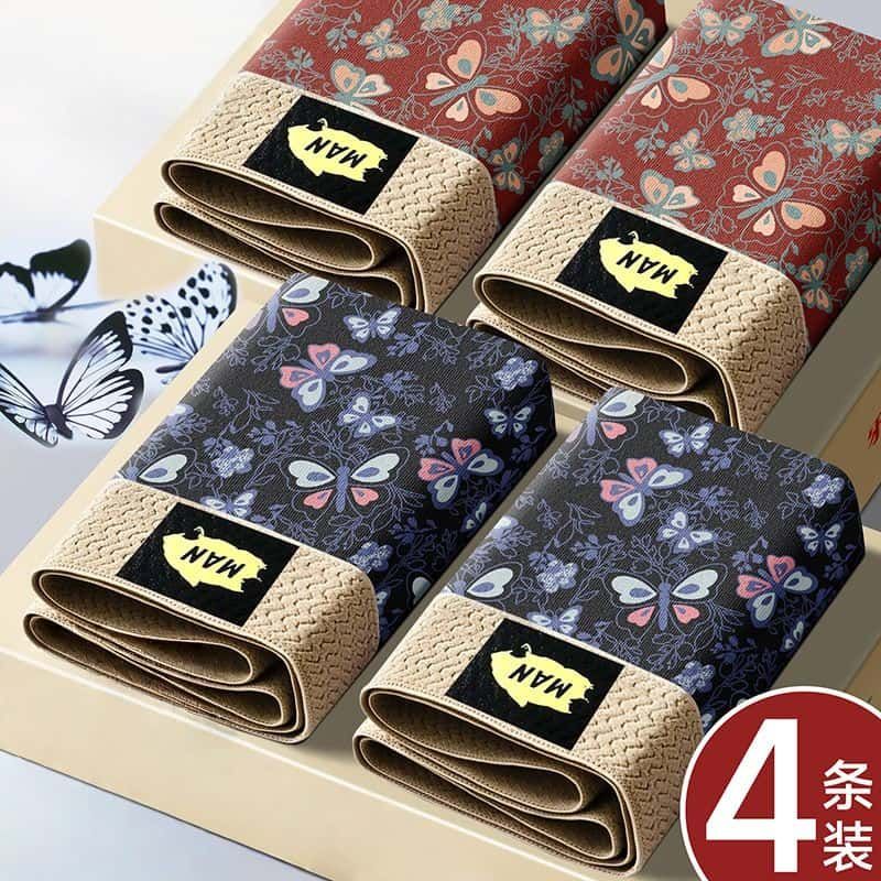 4条装男士内裤中腰抗菌四角裤潮流蝴蝶印花棉质舒适男生平角裤头