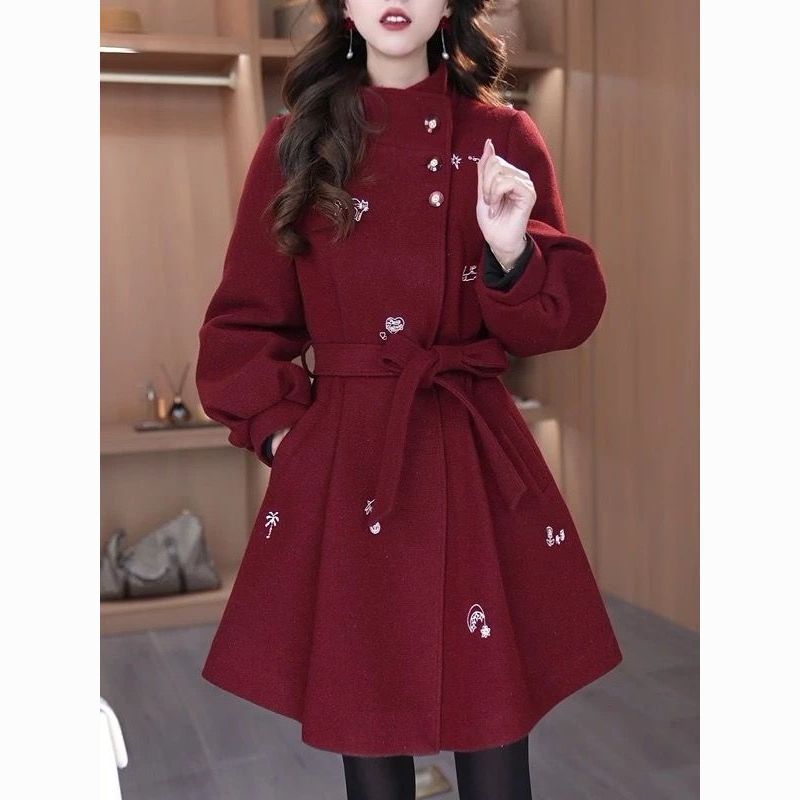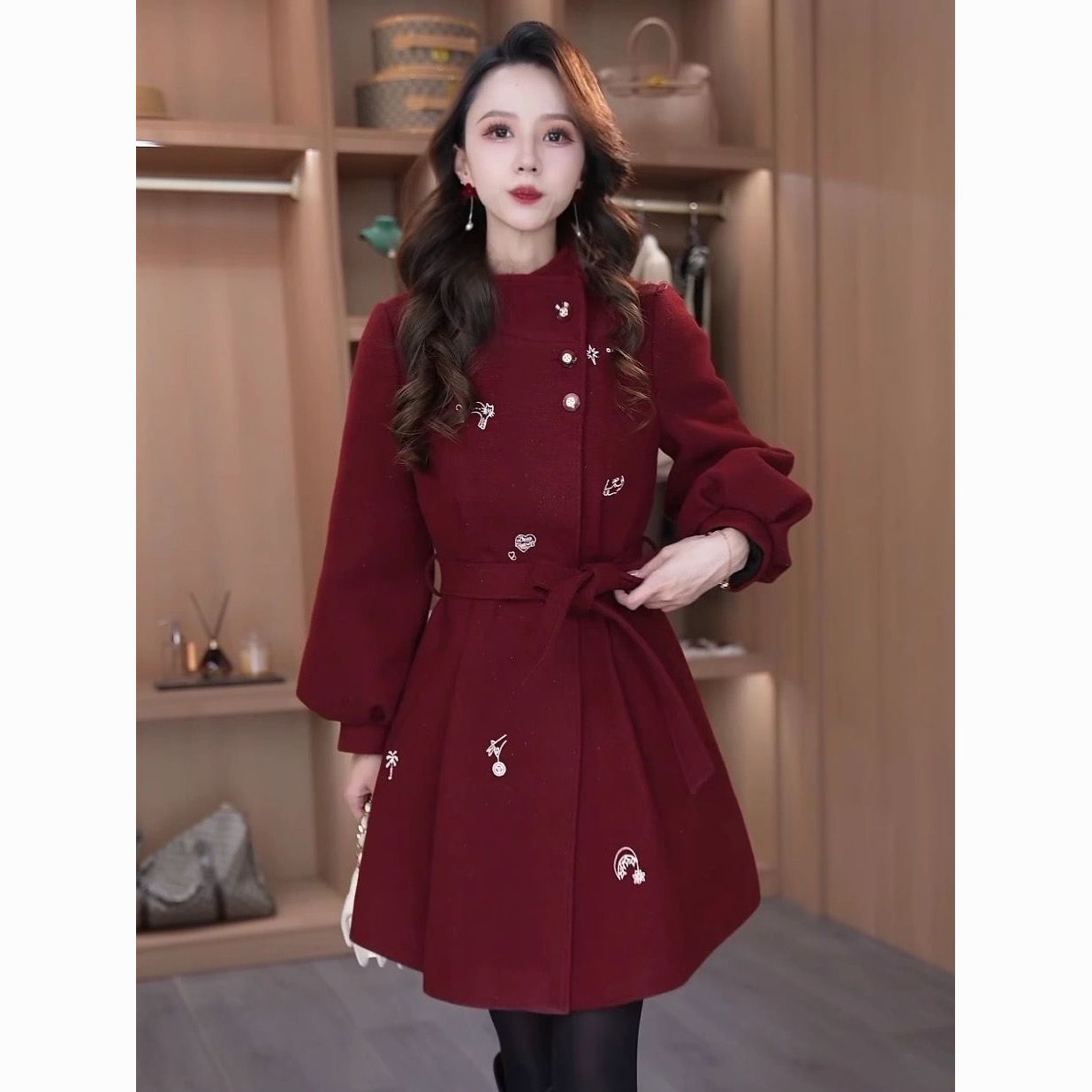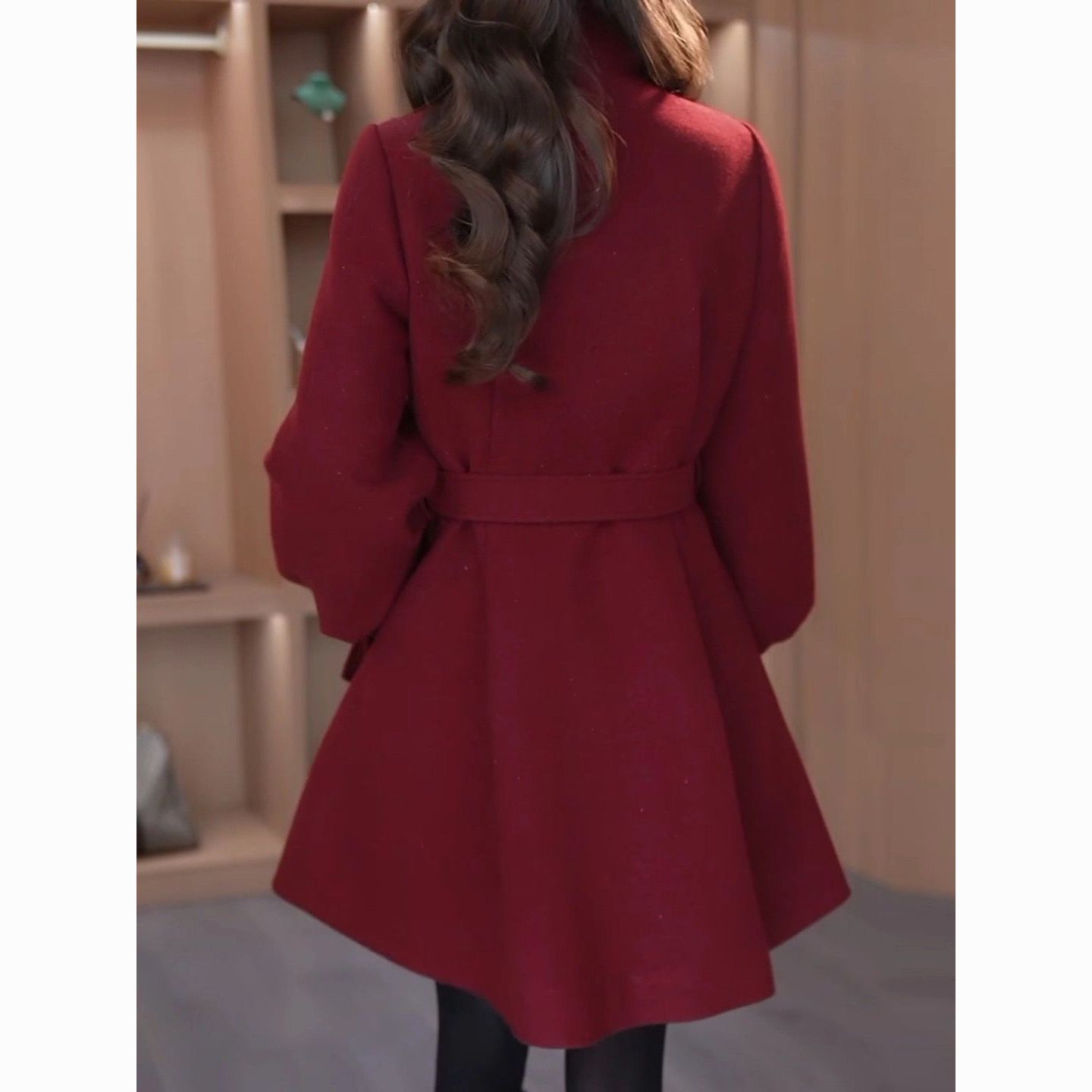 红色加绒加厚毛呢外套女中长款2025新款秋冬季收腰显瘦优雅风大衣【15天内发货】