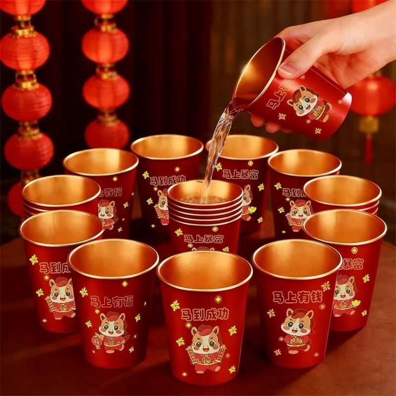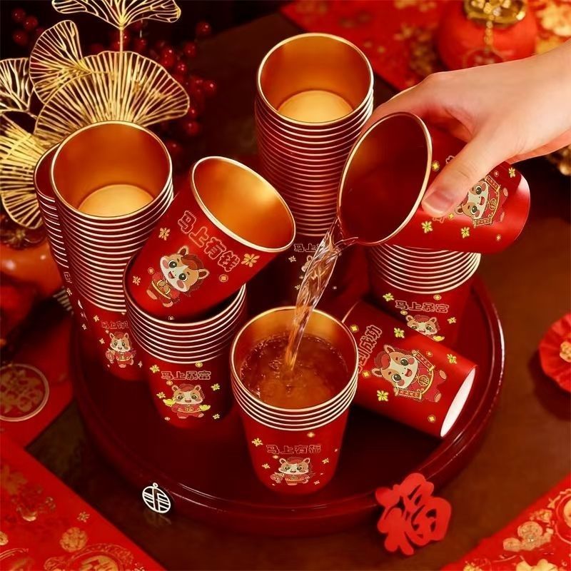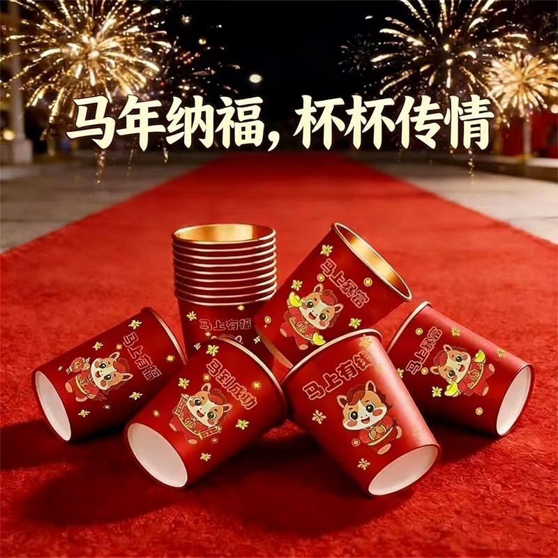 2026新款马年春节纸杯喜庆加厚一次性新年金箔纸金箔水杯家用